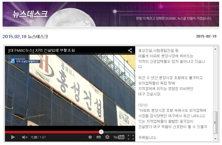 [출처 : 대구 MBC 뉴스데스크 2015.02.19]홍성건설의 새로운 도약, "홍성 블루핀"이 지역 건설업체 부활과 함께합니다.자세한 내용은 대구 MBC 뉴스테스크를 참조하시길 바랍니다.